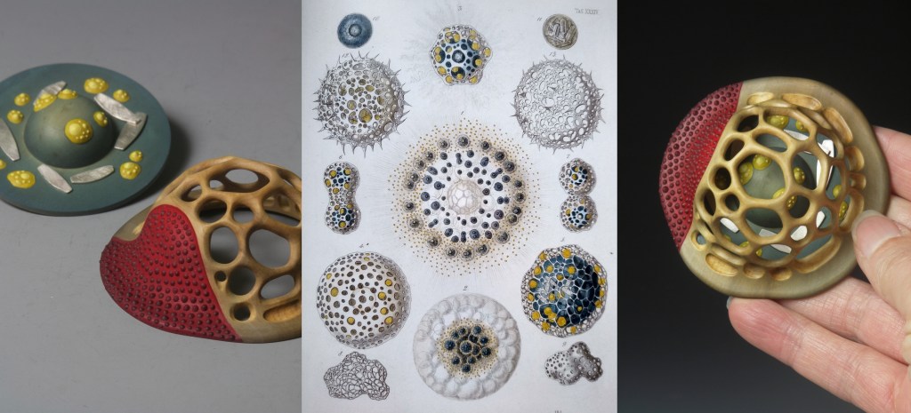 It’s been a while since I last made a piece inspired by the German zoologist Ernst Haeckel, so it was really nice to get a commission from a previous customer to make a pin using images from Haeckel’s ‘Art Forms from the Ocean’ as a starting point.