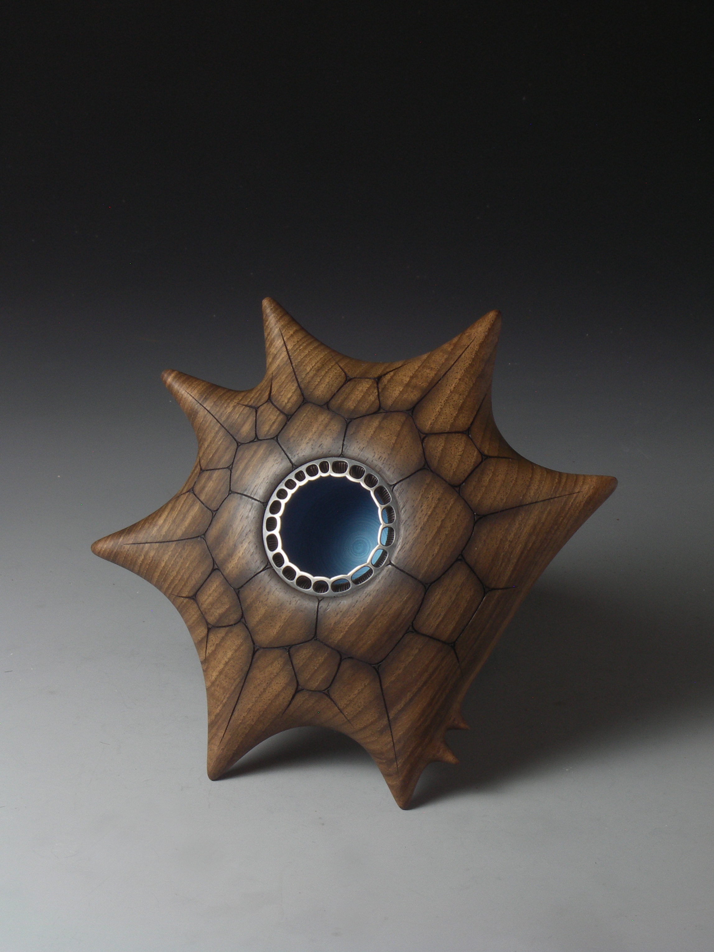 The piece is turned and carved from rippled English walnut. It has a pierced sterling silver insert and has been painted with acrylic paint in the interior. It is 15cm across.