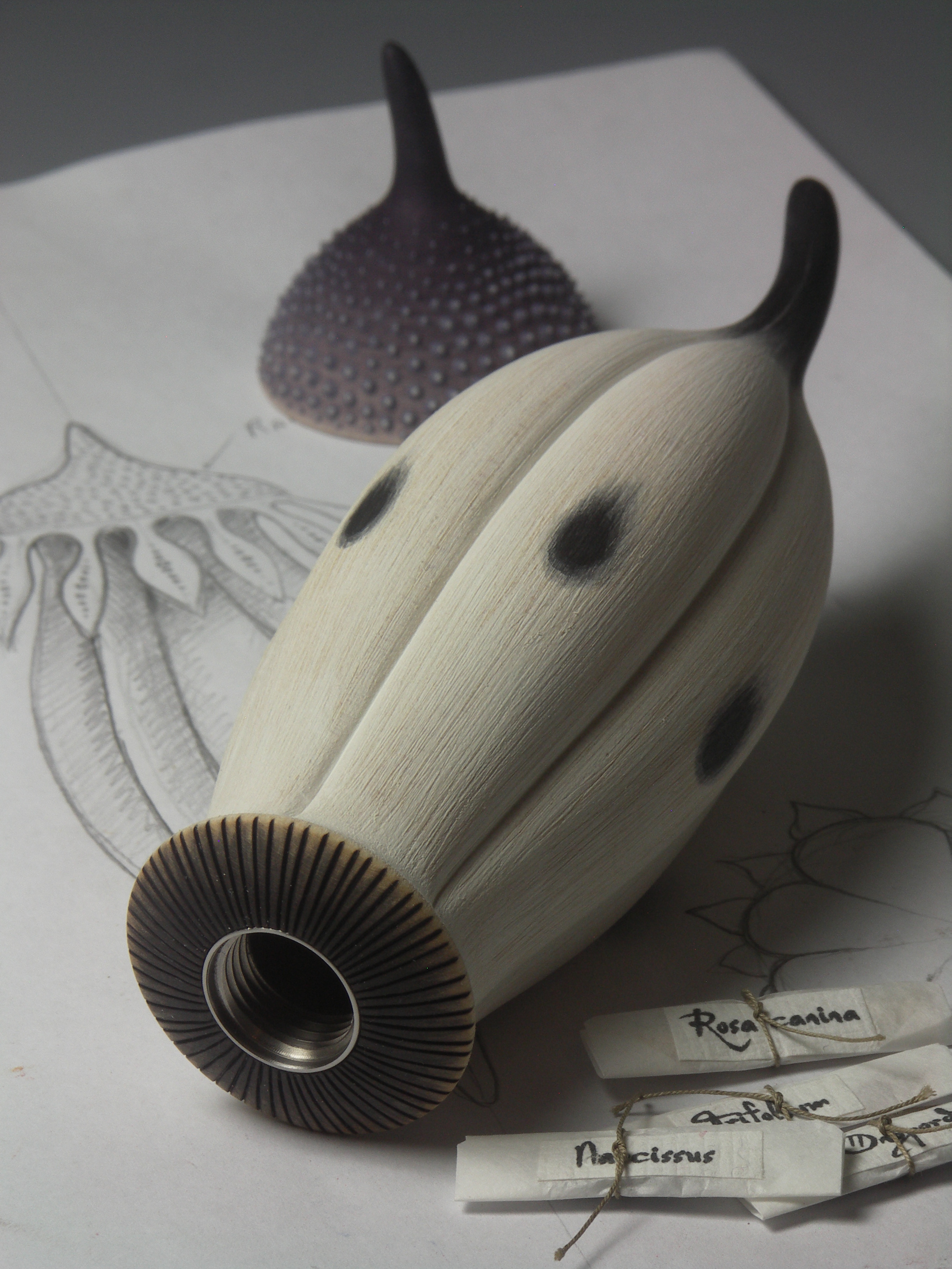 The form originates from Muscinae – the original scientific name for mosses – the oldest land plants on earth at 450 million years. It echoes the mosses seed capsule, and the piece contains seeds from the Scottish thistle, Welsh daffodil, Northern Ireland’s shamrock and English rose, unifying the flora of the four nations of the Untied Kingdom.